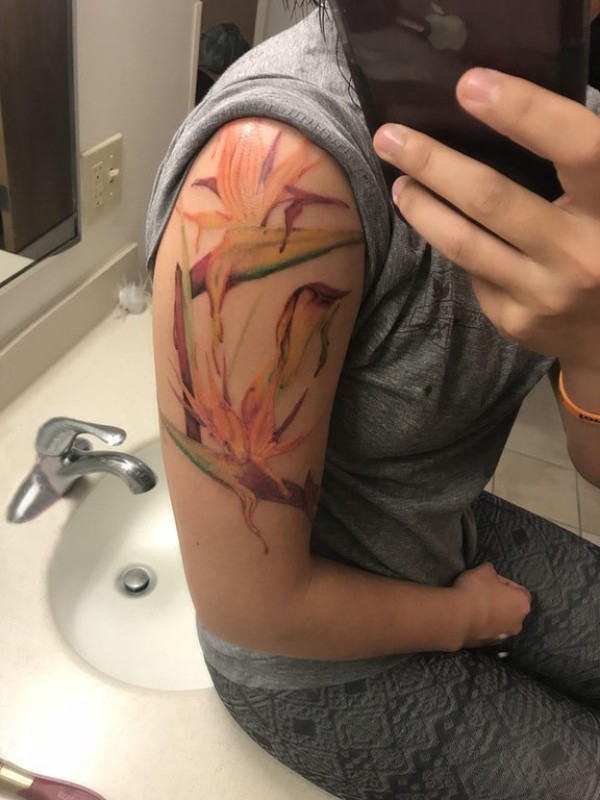 植物纹身 女生大臂上彩色的鹤望兰纹身图片