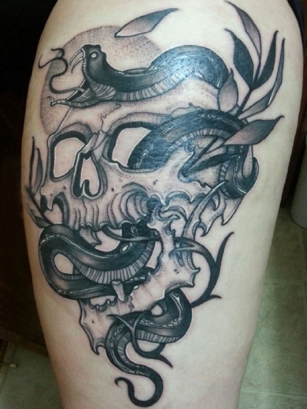 大腿纹身传统 女生大腿上蛇和骷髅纹身图片