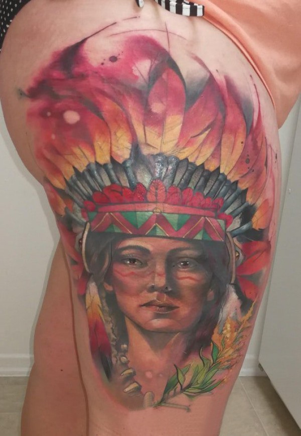 大腿纹身传统 女生大腿上彩色的印第安人纹身图片