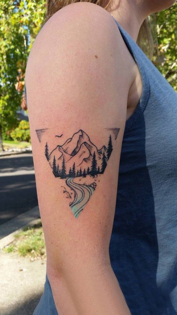 手臂山水纹身 女生大臂上水和山脉纹身图片