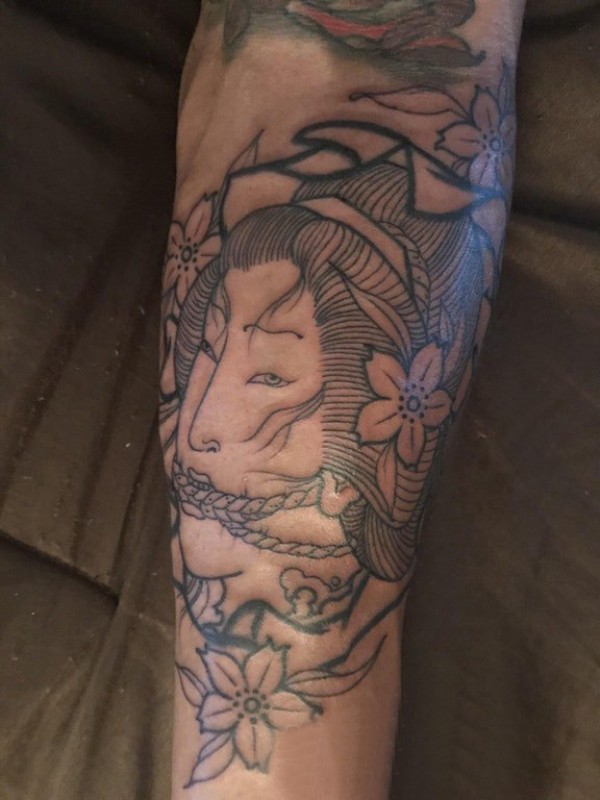 人物肖像纹身 男生手臂上花朵和艺妓纹身图片