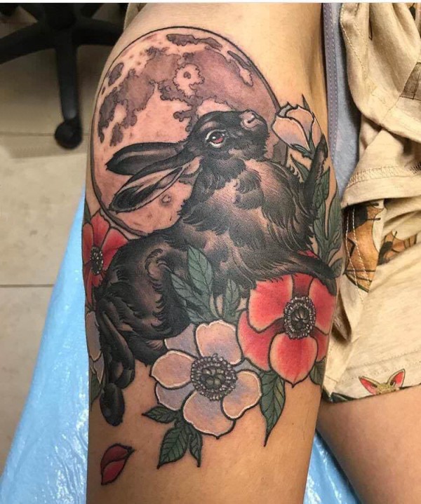 手臂纹身素材 男生手臂上花朵和兔子纹身图片