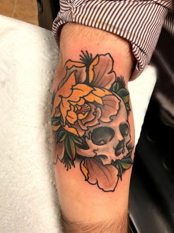 骷髅纹身 男生小腿上花朵和骷髅纹身图片