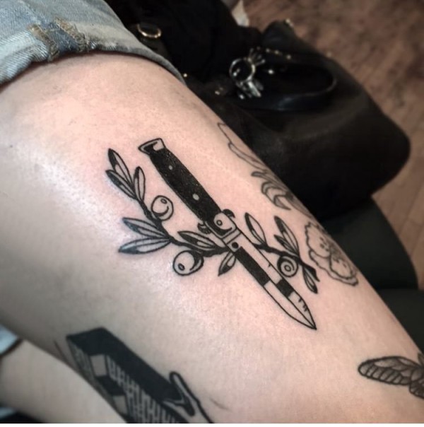大腿纹身传统 女生大腿上植物和匕首纹身图片