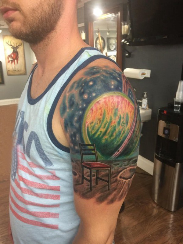 双大臂纹身 男生大臂上椅子和星球纹身图片