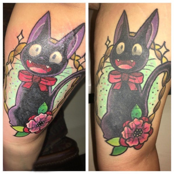 双大臂纹身 女生大臂上花朵和猫咪纹身图片