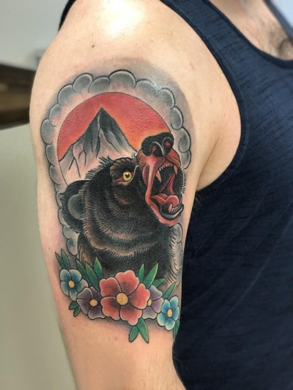 双大臂纹身 男生大臂上花朵和熊纹身图片