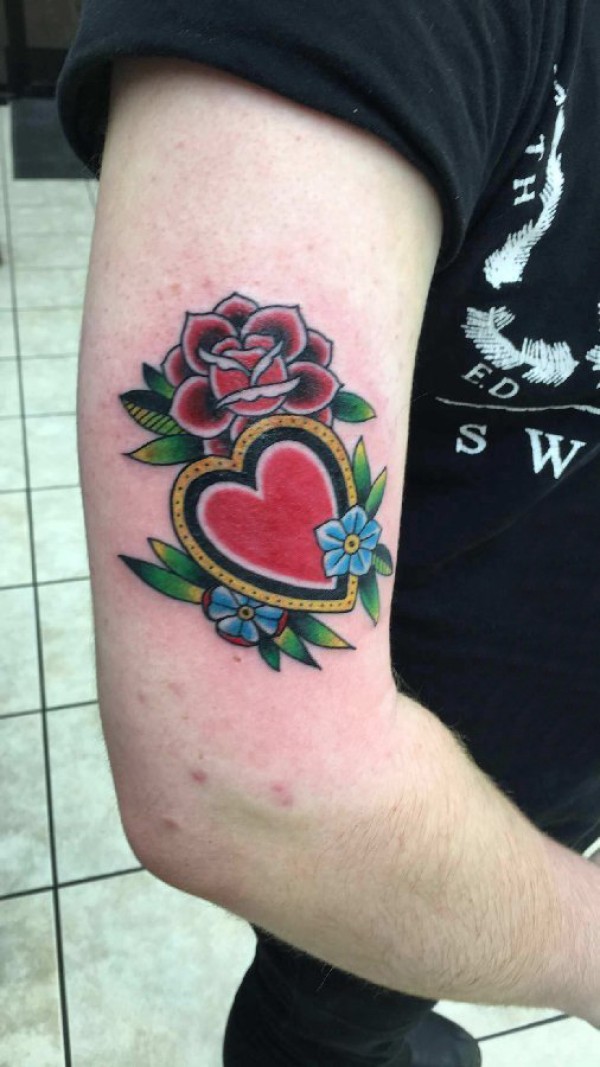 手臂纹身素材 男生手臂上花朵和心形纹身图片