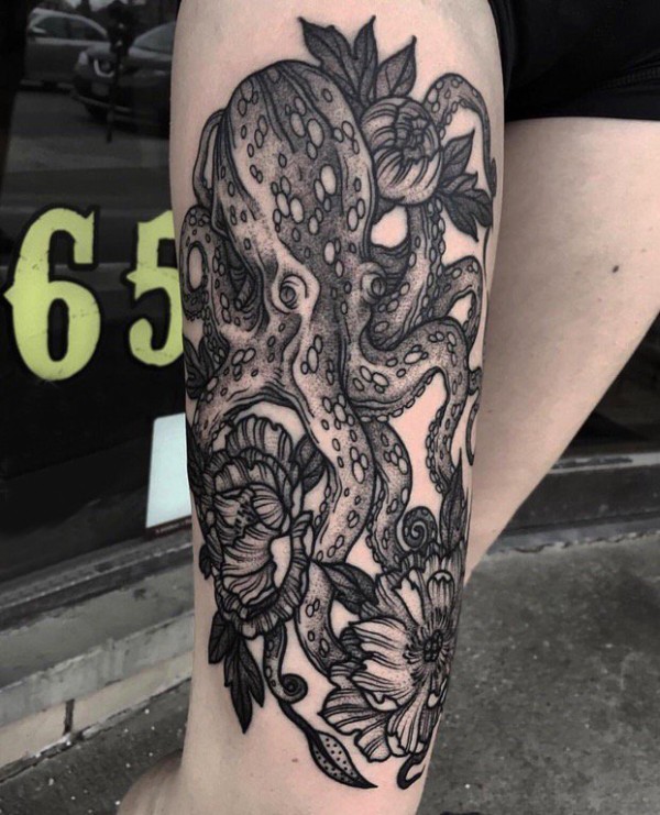 黑色章鱼纹身 女生大腿上黑色章鱼纹身图片