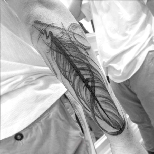 手臂纹身素材 男生手臂上黑色的羽毛纹身图片