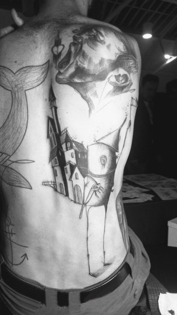 后背纹身男 男生后背上人物和建筑物纹身图片