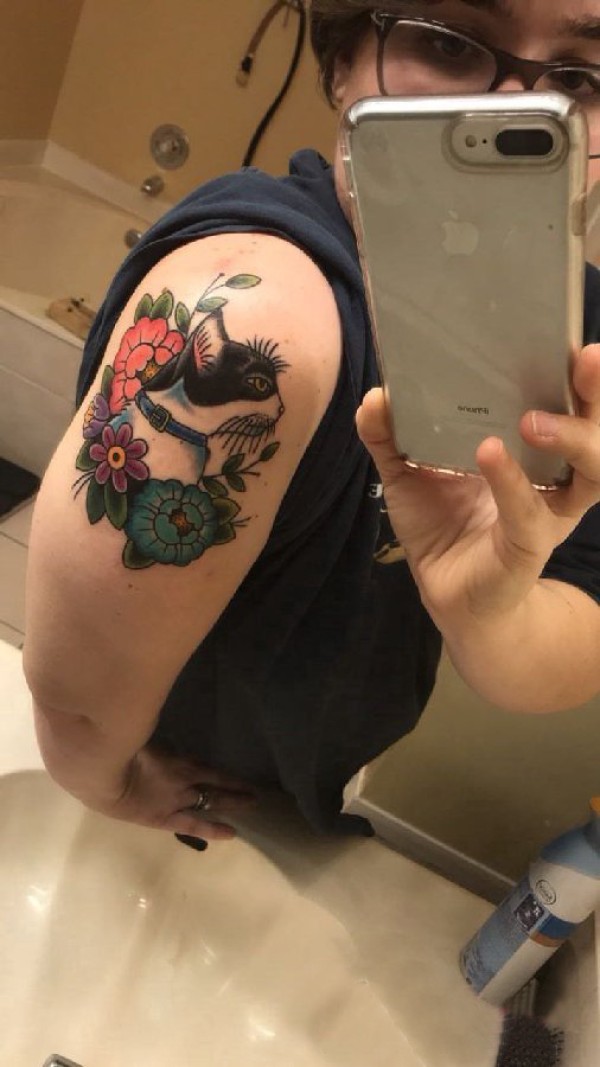 大臂纹身图 女生大臂上花朵和猫咪纹身图片