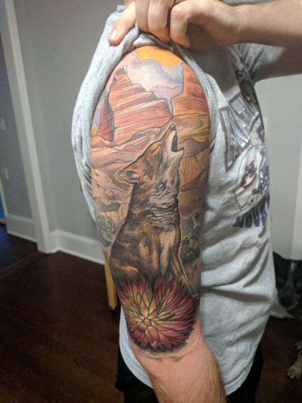 大臂纹身图 男生大臂上花朵和狐狸纹身图片