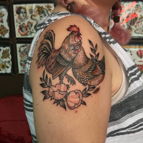 双大臂纹身 女生大臂上花朵和公鸡纹身图片