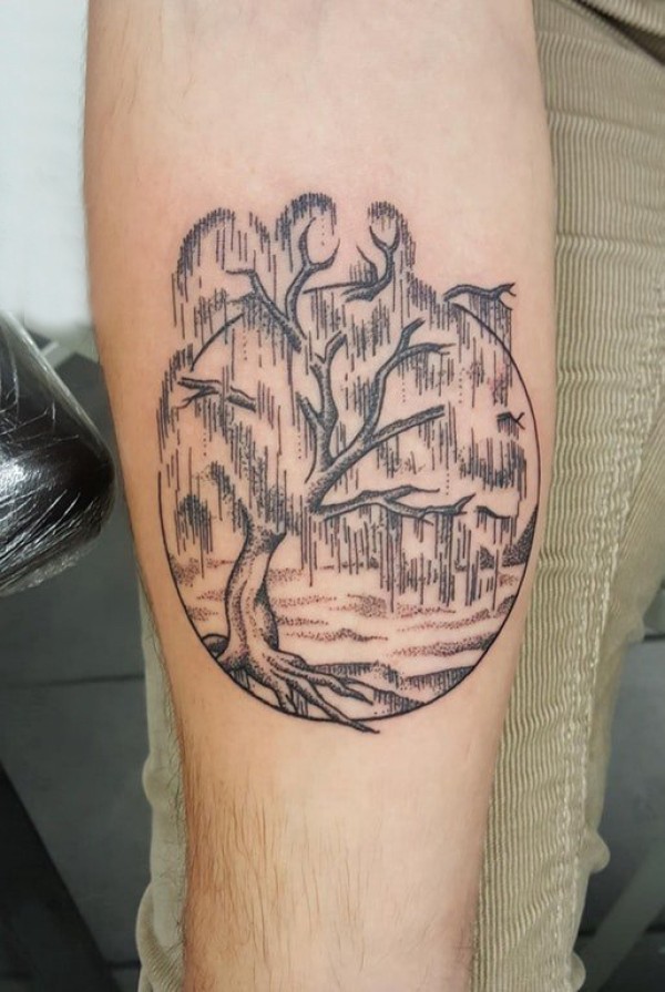 手臂纹身素材 男生手臂上圆形和树纹身图片