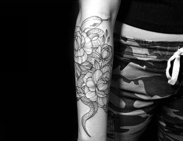 手臂纹身素材 男生手臂上花朵和蛇纹身图片