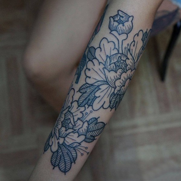 植物纹身素材 女生手臂上黑色的花朵纹身图片