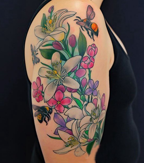 植物纹身 女生大臂上彩绘的花朵纹身图片