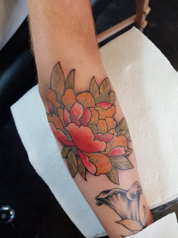 植物纹身 男生手臂上彩色的牡丹纹身图片
