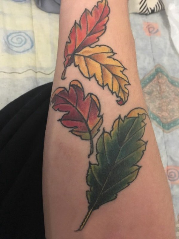 植物纹身 男生手臂上彩色的叶子纹身图片