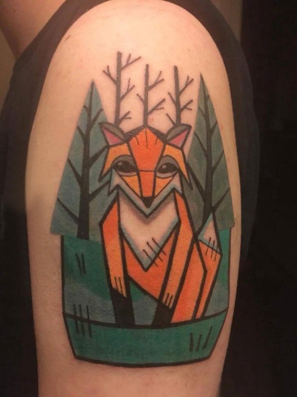 大臂纹身图 男生大臂上树和狐狸纹身图片