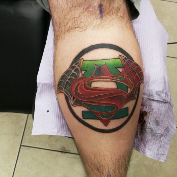 超人标志纹身 男生小腿上圆形和超人标志纹身图片