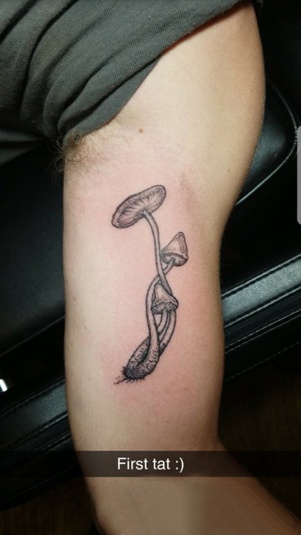 植物纹身 男生大臂上黑色的蘑菇纹身图片