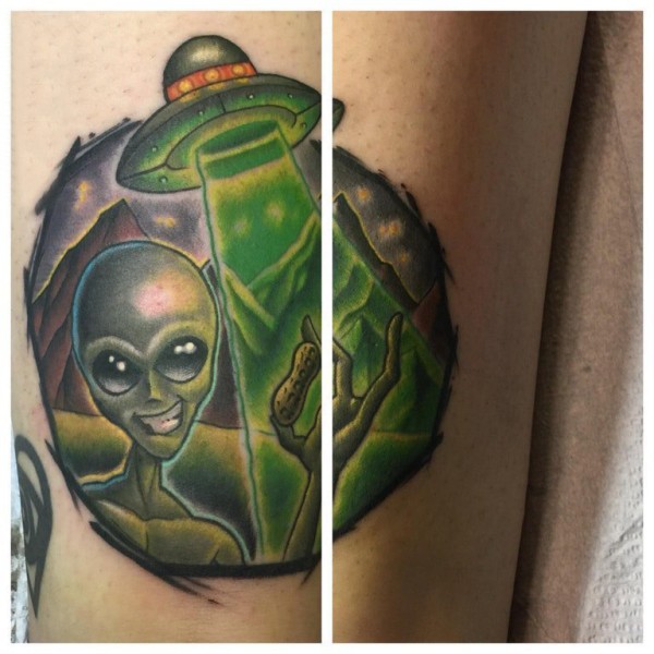 纹身大腿男 男生大腿上飞碟和外星人纹身图片