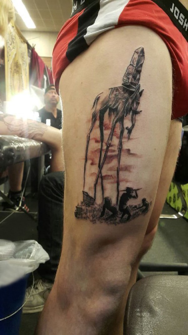 纹身大腿男 男生大腿上黑色的人物和大象纹身图片