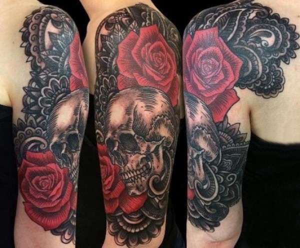 骷髅花朵纹身图案 女生手臂上骷髅花朵纹身图案