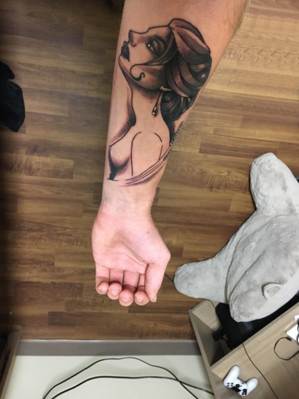 点刺纹身技巧 男生手臂上黑色的人物肖像纹身图片