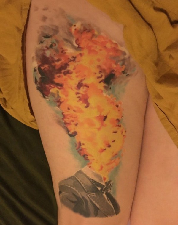 大腿纹身传统 女生大腿上人物和火焰纹身图片