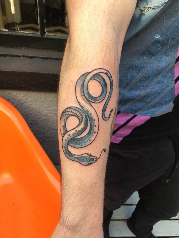 手臂纹身素材 男生手臂上彩色的蛇纹身图片