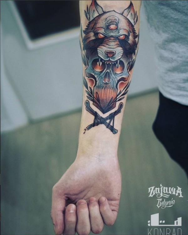 手臂纹身素材 男生手臂上狼头和骷髅纹身图片