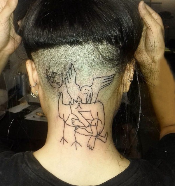 后颈部纹身 女生颈后黑色的卡通纹身图片