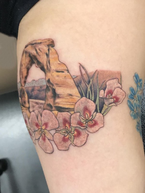 彩绘纹身 女生大腿上石头和花朵纹身图片