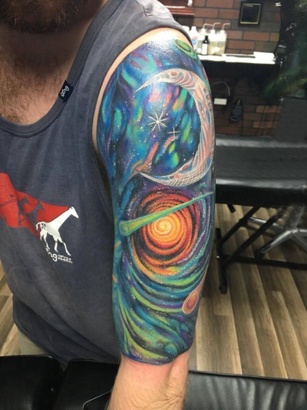 双大臂纹身 男生大臂上彩色的宇宙纹身图片
