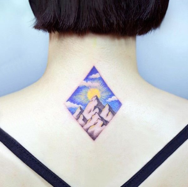 后颈部纹身 女生后颈上菱形和山脉纹身图片
