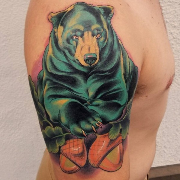双大臂纹身 男生大臂上彩色的熊纹身图片
