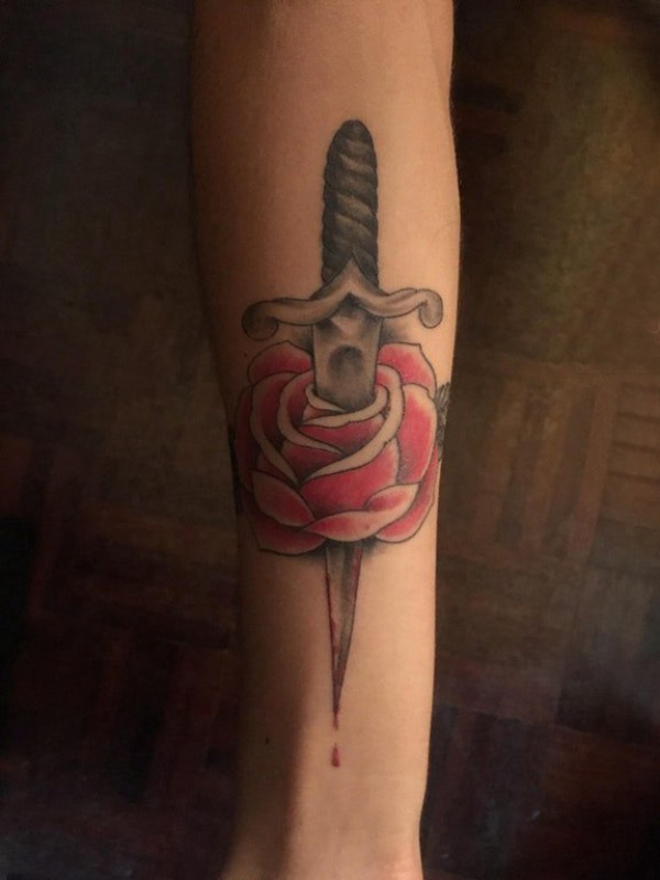 手臂纹身图案女生 女生手臂上玫瑰和匕首纹身图片