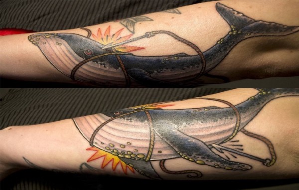 手臂纹身素材 情侣手臂上彩色的鲸鱼纹身图片