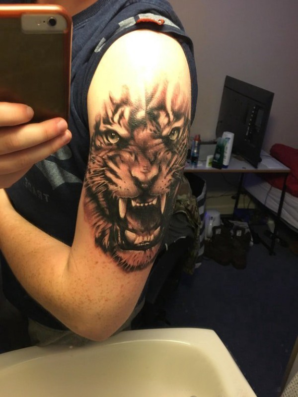 纹身点刺技巧 男生大臂上黑色的老虎纹身图片