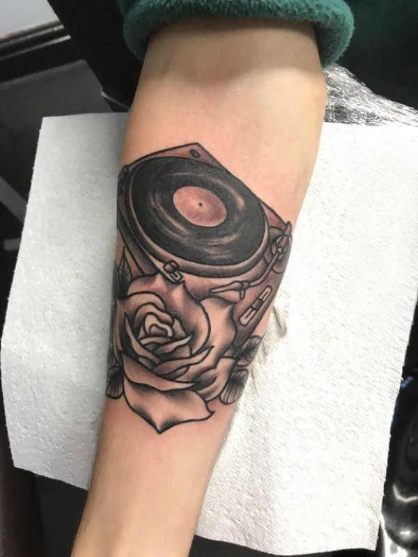 纹身点刺技巧 男生手臂上玫瑰和唱片机纹身图片