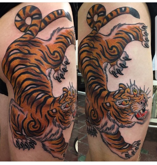 纹身大腿男 男生大腿上彩色的老虎纹身图片