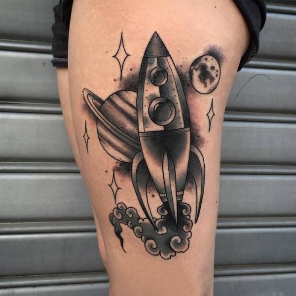纹身大腿男 男生大腿上星球和火箭纹身图片