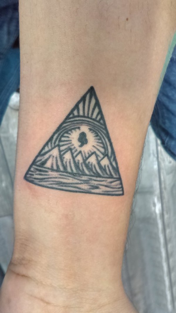 手臂纹身素材 男生手臂上三角形和风景纹身图片