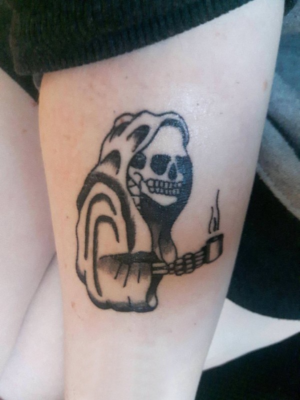 纹身点刺技巧 男生小腿上黑色的骷髅纹身图片