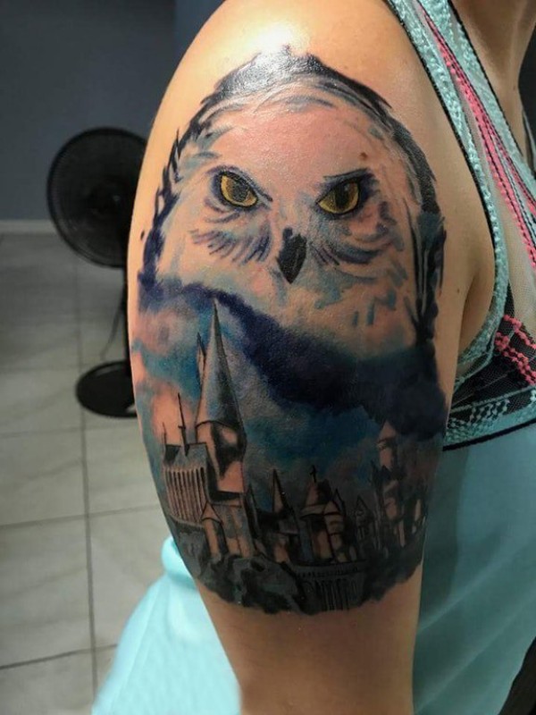 双大臂纹身 女生大臂上建筑物和猫头鹰纹身图片