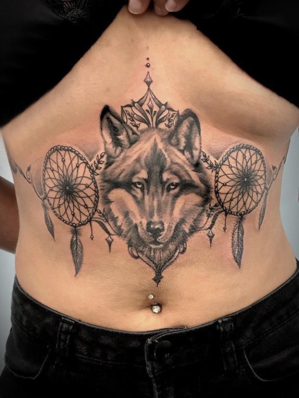 腹部纹身 女生腹部捕梦网和狼头纹身图片