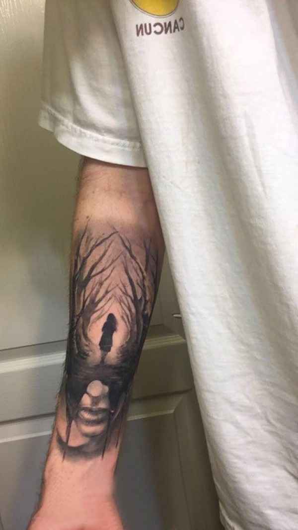 手臂纹身素材 男生手臂上人物和树枝纹身图片